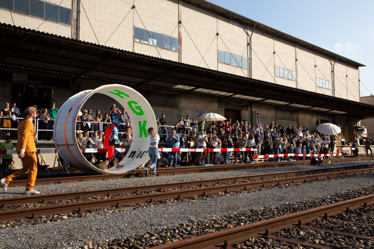 Ziel war es, ein kreatives Gefährt für das Draisinenrennen zu bauen. Enstanden ist schlussendlich ein riesiges Hamsterrad, welches von der fahrenden Person selbst angetrieben werden konnte.