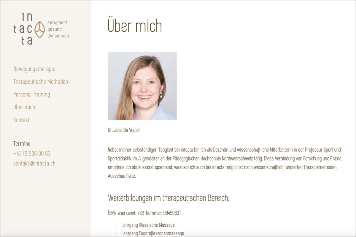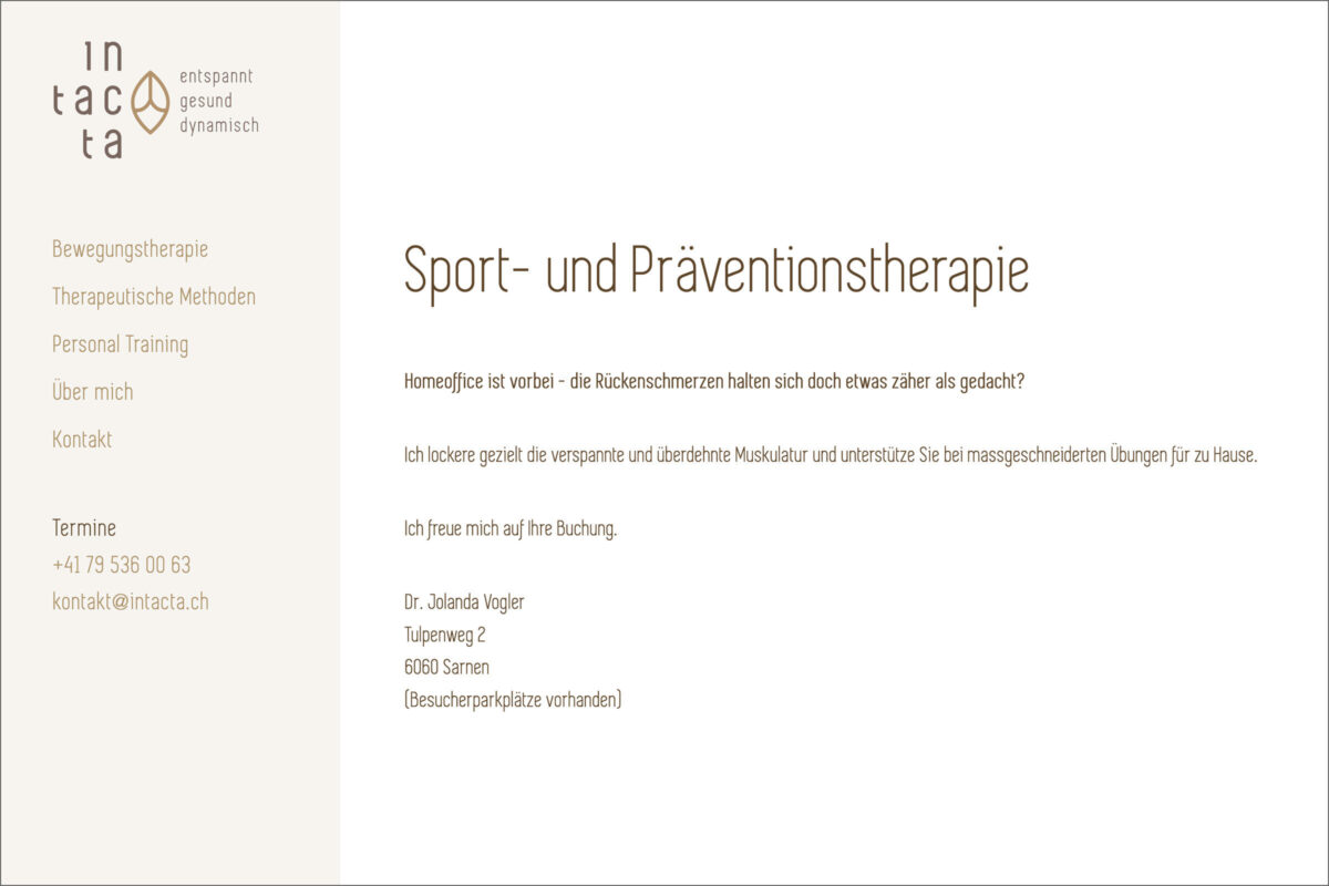 Für eine Praxis, welche Sport- und Präventionstherapie anbietet, durfte ich eine schlichte und übersichtliche Webpräsenz erstellen. Die Möglichkeit zur Kontaktaufnahme sollte dabei im Vordergrund stehen.